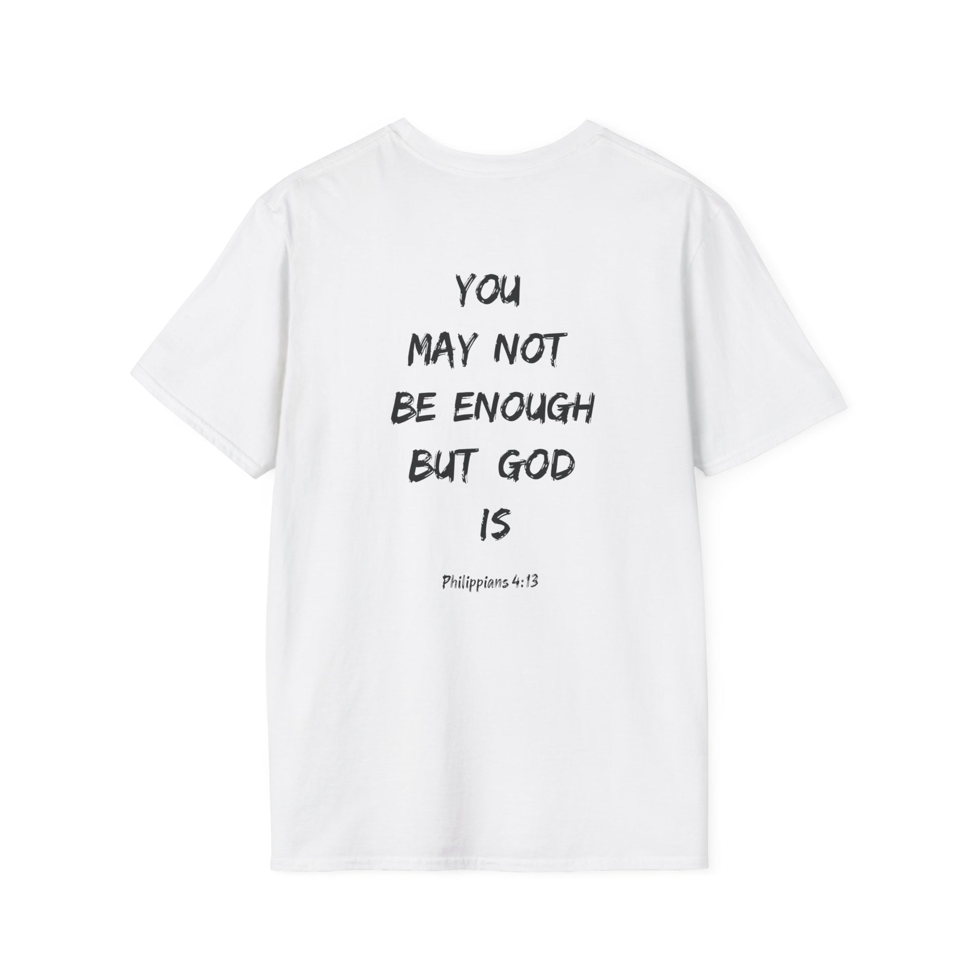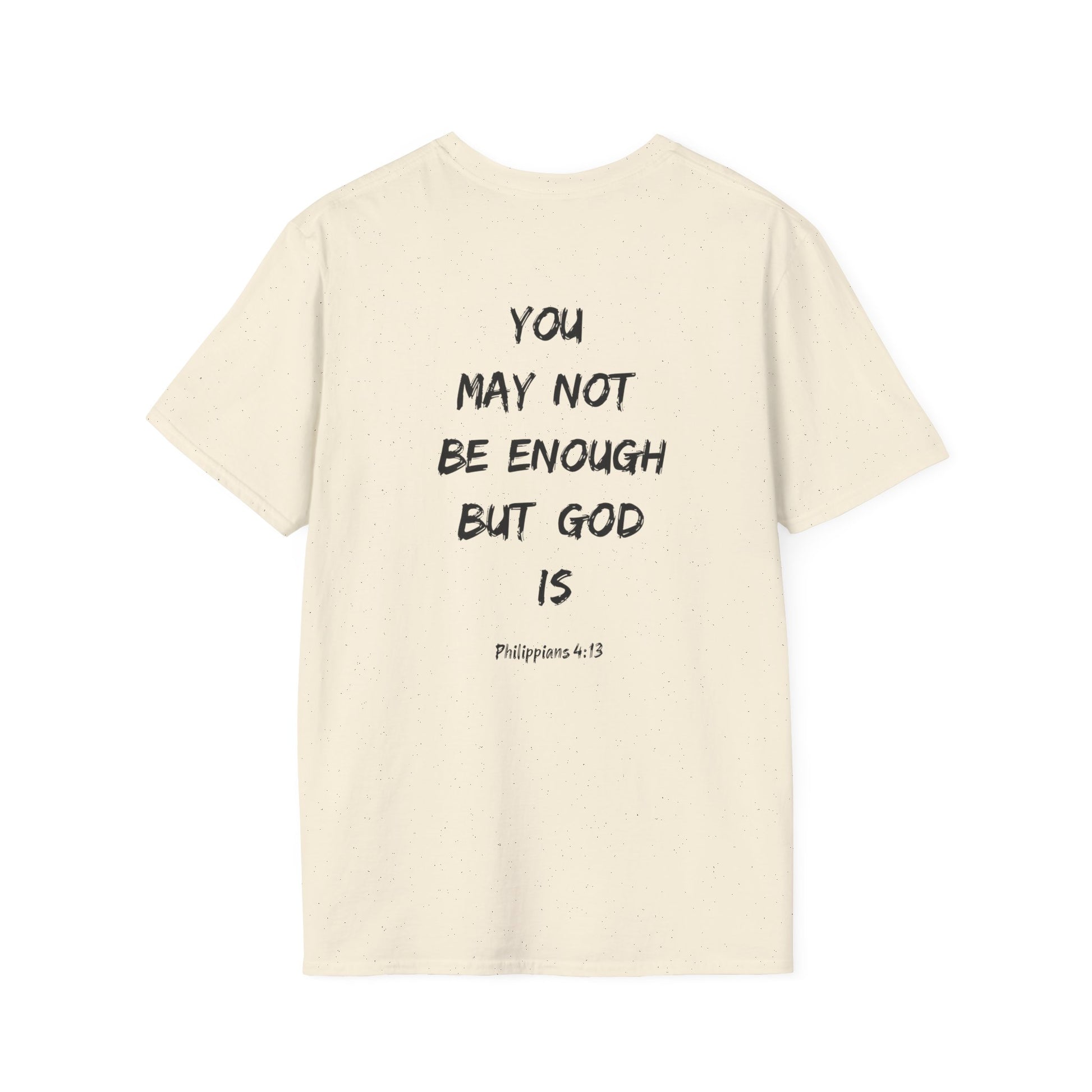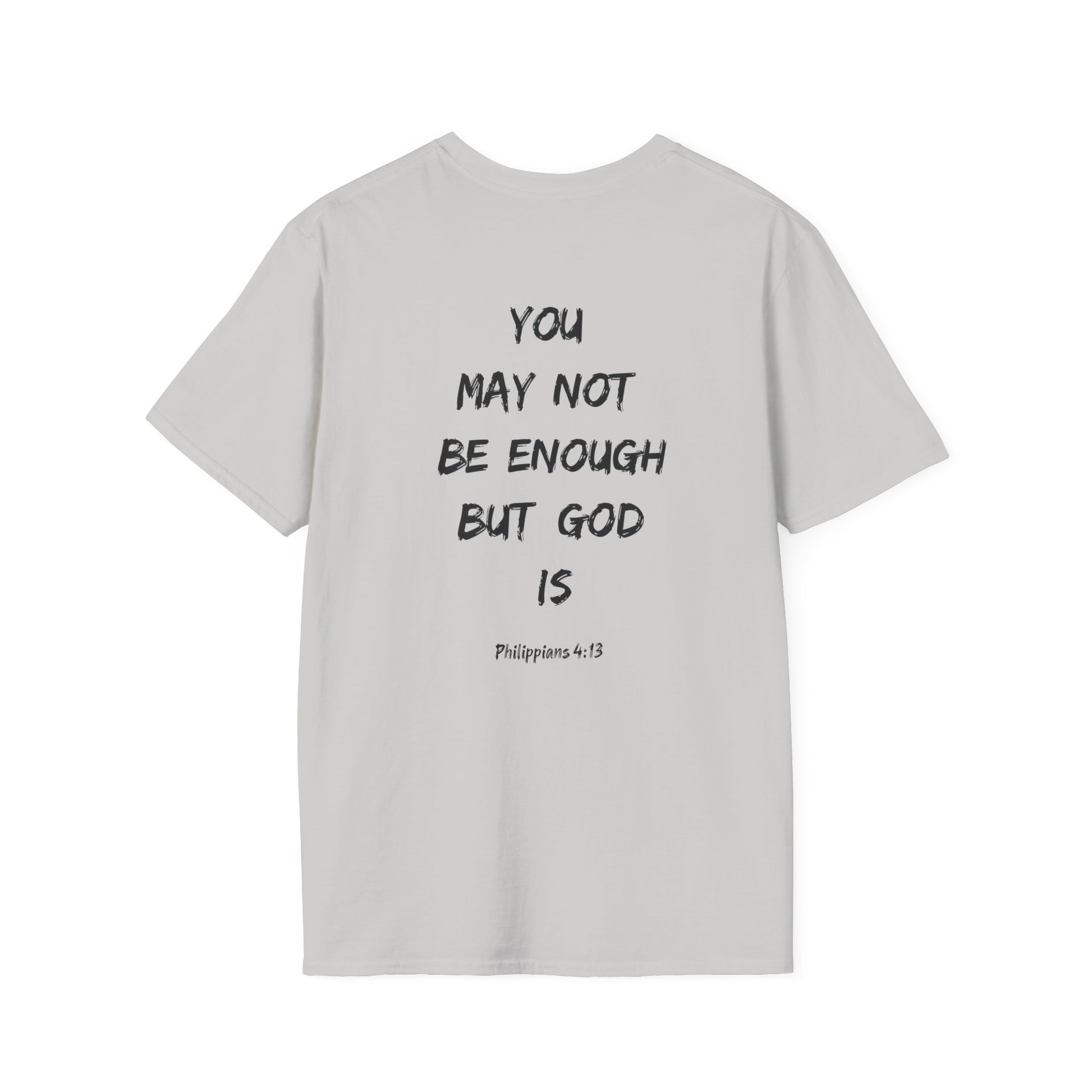 A faith-inspired unisex T-shirt featuring the quote 'You may be not good enough, but God is' from Philippians 4:13. This lightweight and durable T-shirt is perfect for daily wear, offering a clean and versatile style suitable for any occasion. Ideal for those looking to express their faith in a stylish way.